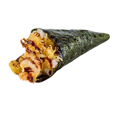 Gambero in tempura, avocado, maionese, chips di patate e salsa teriyaki.