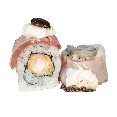 Tempura di gambero, sopra tonno scottato, philadephia e salsa tartufo.